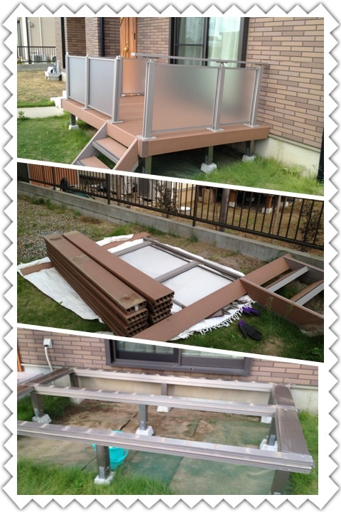 夢のマイホームが傾きつづけてしまってウッドデッキがシャッター付きのサッシ枠に押されこのままではウッドデッキかシャッターか周辺が壊れてしまうということでまずはウッドデッキの解体そして家をまっすぐにしたら再施工をさせていただくということで即日対応(^-^)/